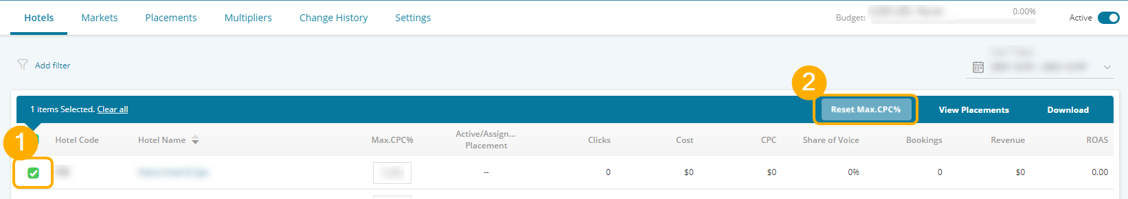 Notes: You can also change the Max CPC at Hotel level: ① We will assign the campaign level Max CPC as the default hotel level Max CPC. If you input hotel level Max CPC, we will use hotel level value instead of campaign level. ② If you want to remove the hotel level Max CPC, you can select the hotel and click Reset Max.CPC button.